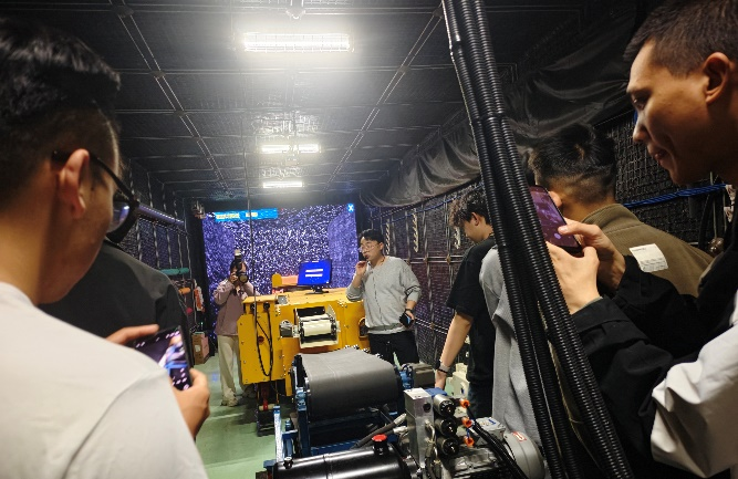实习第二站,教学团队组织参观该校新建的智能化模拟矿井实训基地。该基地1:1复刻的井下作业系统包含:综采工作面数字孪生平台;智能通风监测预警系统;应急救援虚拟仿真训练舱。学生在教师指导下完成巷道避灾路线规划、瓦斯监测设备操作等实景训练,建立起对煤矿安全生产流程的直观认知。