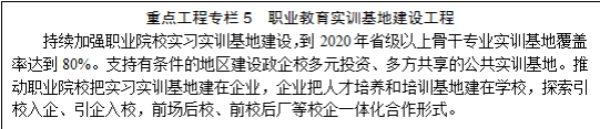 加强职业学校基础能力建设。实施职业教育水平提升工程,夯实职业教育基础条件,着力建设一批服务山西发展战略新兴产业以及扶贫开发等重点工作领域的高水平职业学校和骨干专业。发挥设区市政府的主导作用,依托工业园区、科技开发区等技术技能聚焦区,集成整合中高职院校,建设优势互补、资源共享的职业教育园区。到2020年,中等职业学校、高等职业院校基本办学条件达到国家规定的办学标准,全面完成县级职教中心达标建设任务,省级以上骨干专业实训基地覆盖率达到80%,围绕全省企业、社会发展需求支持建设100个高职省级重点专业、300个中职省级重点专业,启动建设100所省级中等职业教育改革发展示范校。