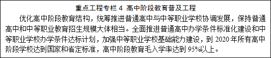 提升普通高中学校发展水平。统筹普通高中和中等职业教育协调发展。实施普及高中阶段教育攻坚计划,加强条件保障,推进普通高中标准化建设,改善普通高中办学条件。优化结构布局,继续支持贫困地区普通高中建设,保留并办好必要的乡村高中。实施优质高中帮扶计划,积极推进普通高中办学模式改革,扩大优质教育资源。建立合理的成本分担机制,健全公办普通高中生均公用经费拨款制度,完善学费动态调整机制,保障学校正常运转。逐步化解公办普通高中债务。