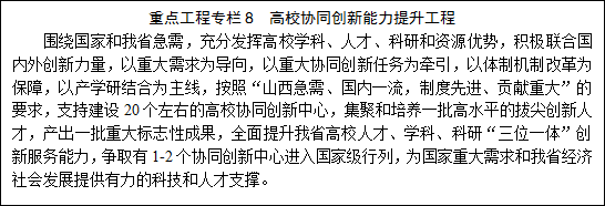 提升高校科技创新能力。推动高校积极参与国家创新体系建设,组织和支持高校参与国家重大科技攻关计划,承担国家重大科研项目,培育和建设若干重点实验室、工程技术研究中心和产业技术创新联盟,引导高校主动融入科技创新城、高新技术产业开发区建设,大力开展基础研究、应用研究和决策咨询研究。改革完善和持续推进高等学校创新能力提升计划,推动高校聚焦国家和我省重大战略需求,整合创新资源,多学科交叉融合,产学研协同创新。