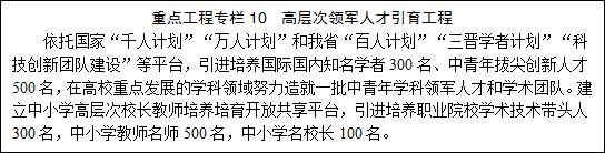 吸引更多优秀人才从教。依托国家“千人计划”“万人计划”“长江学者奖励计划”“国家杰出青年科学基金”和我省“三晋学者”“百人计划”等平台,大力引进培养高校学科领军人才、科技创新人才和青年拔尖人才,对我省急需紧缺的优秀人才团队和特殊人才,开辟专门通道,实行特殊政策,实现精准引进。制定激励政策,在高校和职业学校设立流动岗位,吸引具有创新实践经验的企业家、高科技人才及各类高级专业人才担任兼职教师或专业带头人。加快高校薪酬制度改革,不断增加绩效工资总量和分配力度,放活成果转化奖励收入,鼓励探索高层次人才协议工资制等分配办法,调动高校教职工积极性。