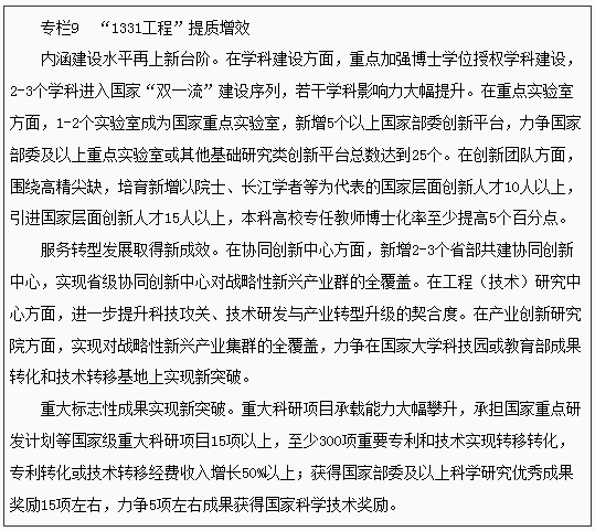 深入推进“1331工程”提质增效,支持有条件高校开展有组织科研攻关,培育科技力量,培优创新生态。以国家和教育部重点实验室为核心,联合其他省部级重点实验室,加强基础研究,围绕前瞻性、战略性、前沿性重大科学技术问题开展联合攻关和协同创新。以国家和教育部工程(技术)研究中心为核心,联合其他省部级工程(技术)研究中心,围绕集成化、工程化、产业化的重大技术研发问题开展联合攻关和协同创新。支持极端光学、煤与煤层气绿色清洁开发利用等省部共建国家协同创新中心,加大与省内高校、科研院所、企业协同力度,开展联合攻关。重点支持高校与企业、科研院所及其他创新力量,联合共建30个左右省级协同创新中心,围绕产业转型升级的“卡脖子”关键技术进行联合攻关和协同创新。支持国家级双创示范基地、国家级大学科技园、教育部成果转化与技术转移基地等创新平台建设,推动科学研究、人才培养、成果转化与地方和产业需求精准对接。加强高校人文社会科学重点研究基地建设,深入开展原创性、特色性项目研究。大力弘扬科学家精神,深化科研诚信与作风学风建设,严惩学术不端行为,持续优化学术生态。