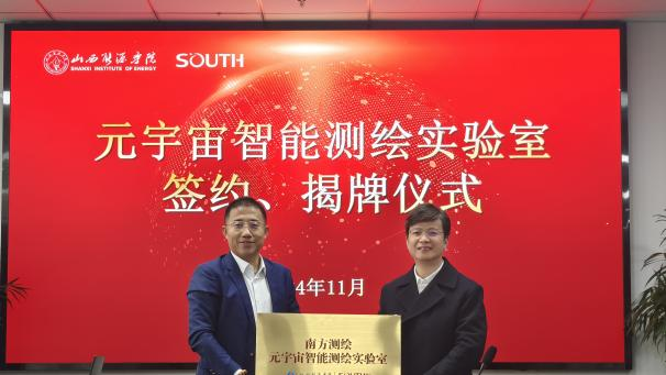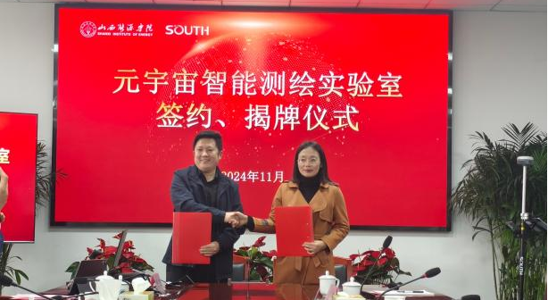 11月18日下午,南方测绘集团副总裁郭宝宇、太原分公司总经理李永宝等一行来我校开展太阳集团官网-南方测绘集团元宇宙智能测绘实验室签约揭牌仪式。学院党委委员、副院长葛波蔚、地质与测绘工程系副主任(主持行政工作)张明媚、实验实训中心副主任常天印及地测系部分教师参加了此次仪式,张明媚主持了签约揭牌仪式。