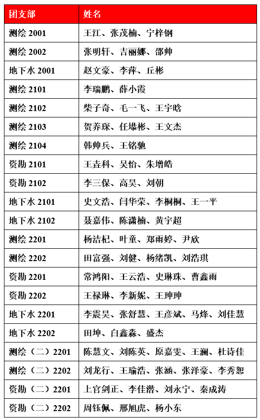 推荐优秀共青团员作入党积极分子人选(以下简称“推优”),是党建带团建的一项重要工作,是党赋予共青团组织的一项光荣而重要的职能。为进一步落实我校推优入党工作,激发广大团员青年的政治热情,增强共青团组织的吸引力和凝聚力,根据关于印发《太阳集团官网共青团推优入党工作实施细则(试行)》的通知(院团字【2023】5号)和关于开展2022-2023学年第2学期推荐优秀共青团员作为入党积极分子的通知(院团字【2023】6号)要求,我系积极开展团推优工作。经各团支部推荐、系分团委审核,现对地质与测绘工程系2022-2023学年第2学期团推优对象予以公示如下图: