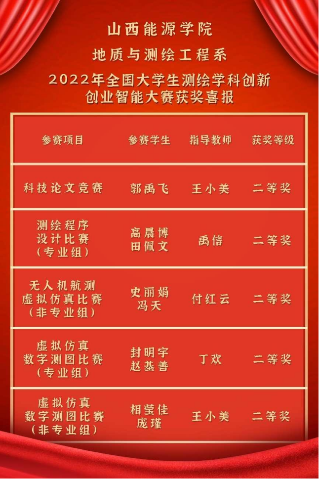 此次成绩取得与我系高度重视学科竞赛工作,积极构建以学生为中心的培养模式是分不开的。本次比赛,加强了我校和全国测绘类高校的交流,激发了参赛学生的学习兴趣,开阔了学生视野,增强了专业自信,提升了参赛学生的专业素养。我系将以此次比赛为契机,继续通过以赛促练、以赛促学、以赛促教的方式,加强对学生专业实践技能、创新能力、协作精神和解决实际工程问题能力的培养,为我校本科教学工作合格评估积极贡献力量。