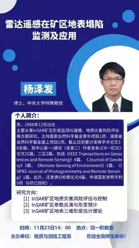 2020年11月23日14:00,地测系将在综一阶教师邀请中南大学杨泽发教授为我院师生作题为《雷达遥感在矿区地表塌陷监测及应用》的学术讲座。届时欢迎全院师生聆听!
