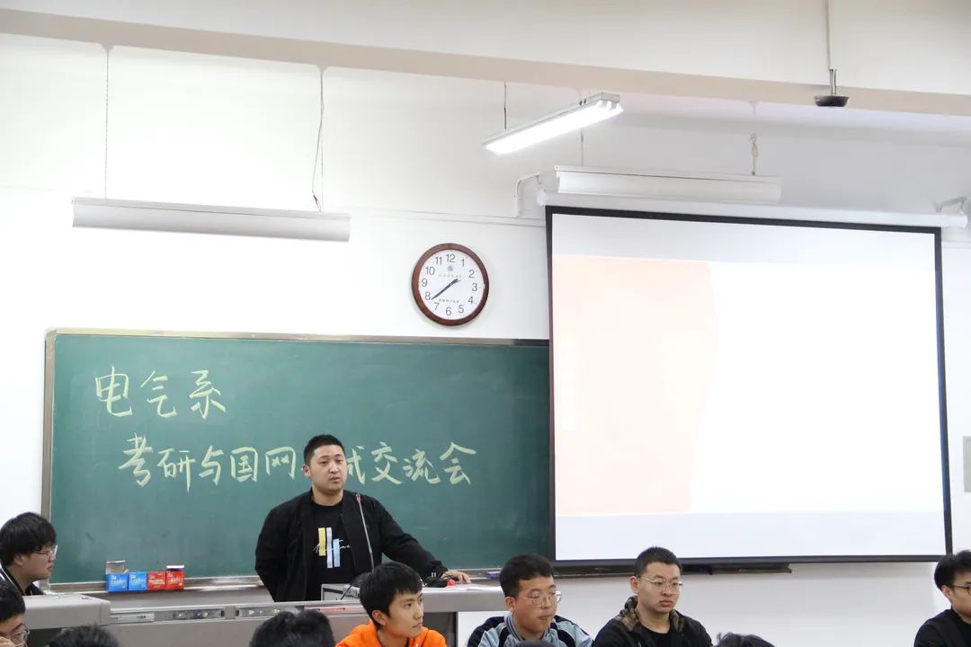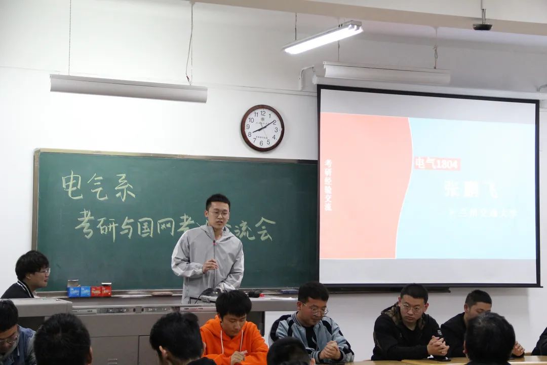 随后,由考研成功及顺利考入国家电网的学长向参会同学分享了他们的经历,以及在学习过程中积累的各种经验与学习方法,并结合自身经历通过备战各科目的方法及技巧、备考复习中应该注意的心理调适、报考信息的收集方法等方面的心得体会鼓舞在座即将考研、考电网的同学们积极备考、精确备考、少走弯路。
