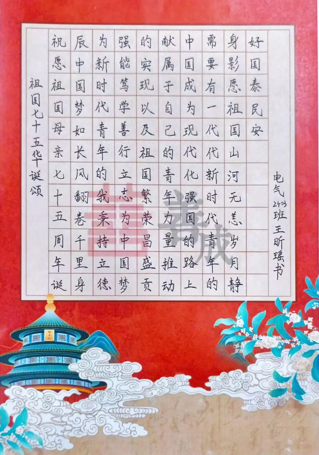 为庆祝中华人民共和国成立75周年,丰富校园文化生活,充分展现中国书画艺术魅力,继承和弘扬中华优秀传统文化,电气与控制工程系特举办“书画山能风采,弘扬爱国情怀”书画大赛。经过评委老师们评选,优胜者已经脱颖而出,下面让我们一起来欣赏佳作吧!
