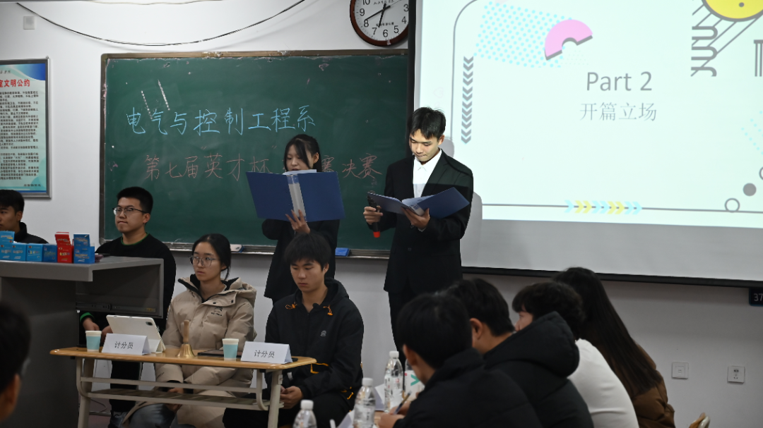 决赛的两支队伍均来自电气2023级,他们以“人才培养更注重理论还是更注重实践”为辩题进行辩论,角逐冠军宝座。