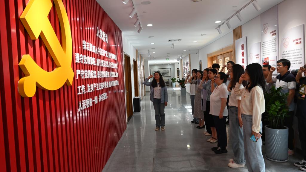 最后,由李芳同志作为领誓人,带领全体党员一起紧握右拳,庄严肃立,重温入党誓词,重忆入党初心。
