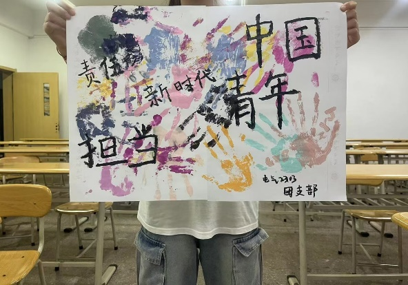 随后,同学们积极参与“共担时代使命”的活动,同学们纷纷使用颜料涂抹在手上,在白纸上印下自己的色彩。青春是一片五彩缤纷,绚烂多姿的花朵。青年人勇于承担时代赋予他们的责任与义务,他们担当责任,拥抱未来,用勇气和信念书写着奋斗的篇章。他们或许默默无闻,或许忙忙碌碌,但作为新时代青年一代,会始终坚持党的领导,“今日之责任,实则艰巨,复兴之任,重于泰山”,他们会尽自己所能,为中国建设美好。纸上的手印,是他们承诺的见证。