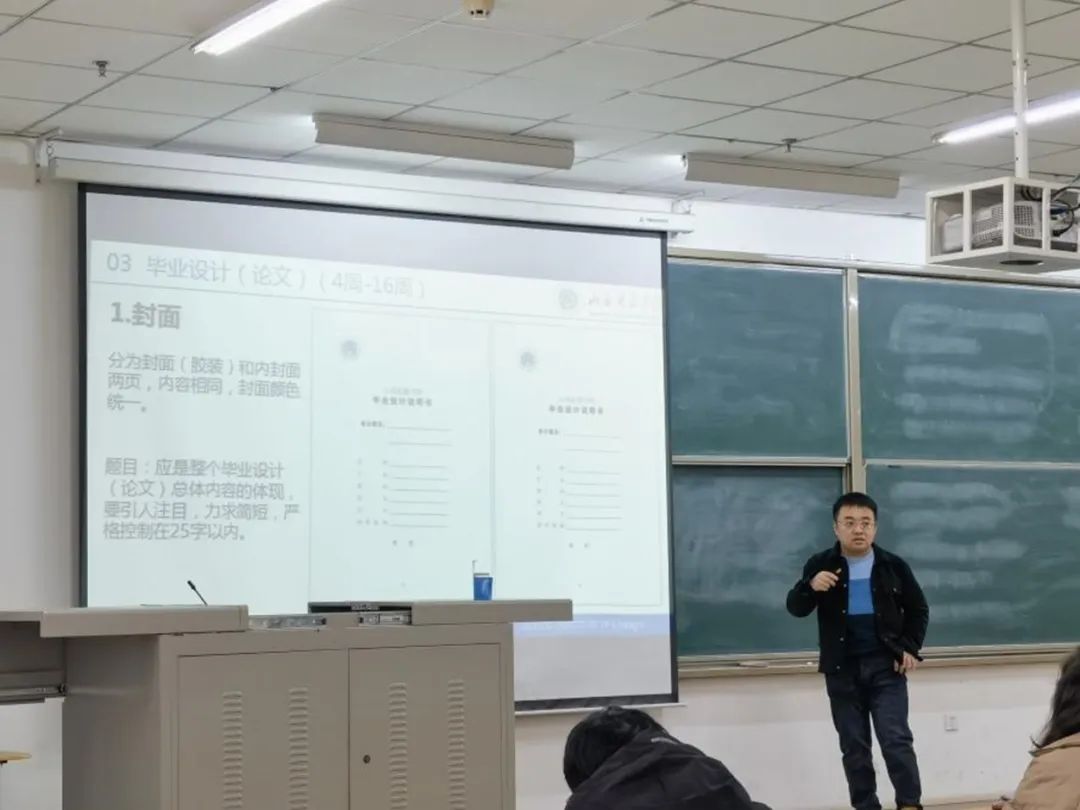 随后,电气教研室主任辛鑫重点从题目征集、文献检索方法、毕业设计的撰写和归档要求、开题报告、中期检查等方面向学生们讲解了毕业设计的具体要求,并要求同学们牢记毕业设计的时间线,在老师的指导下,如期完成相关资料的提交工作。最后,辛老师就毕业实习的要求、进度安排及注意事项做了详细介绍,强调了毕业实习的重要性和严肃性,要求同学们以踏实的作风和严肃的态度,向实习单位指导老师学习,进一步提高自己的专业实践能力。