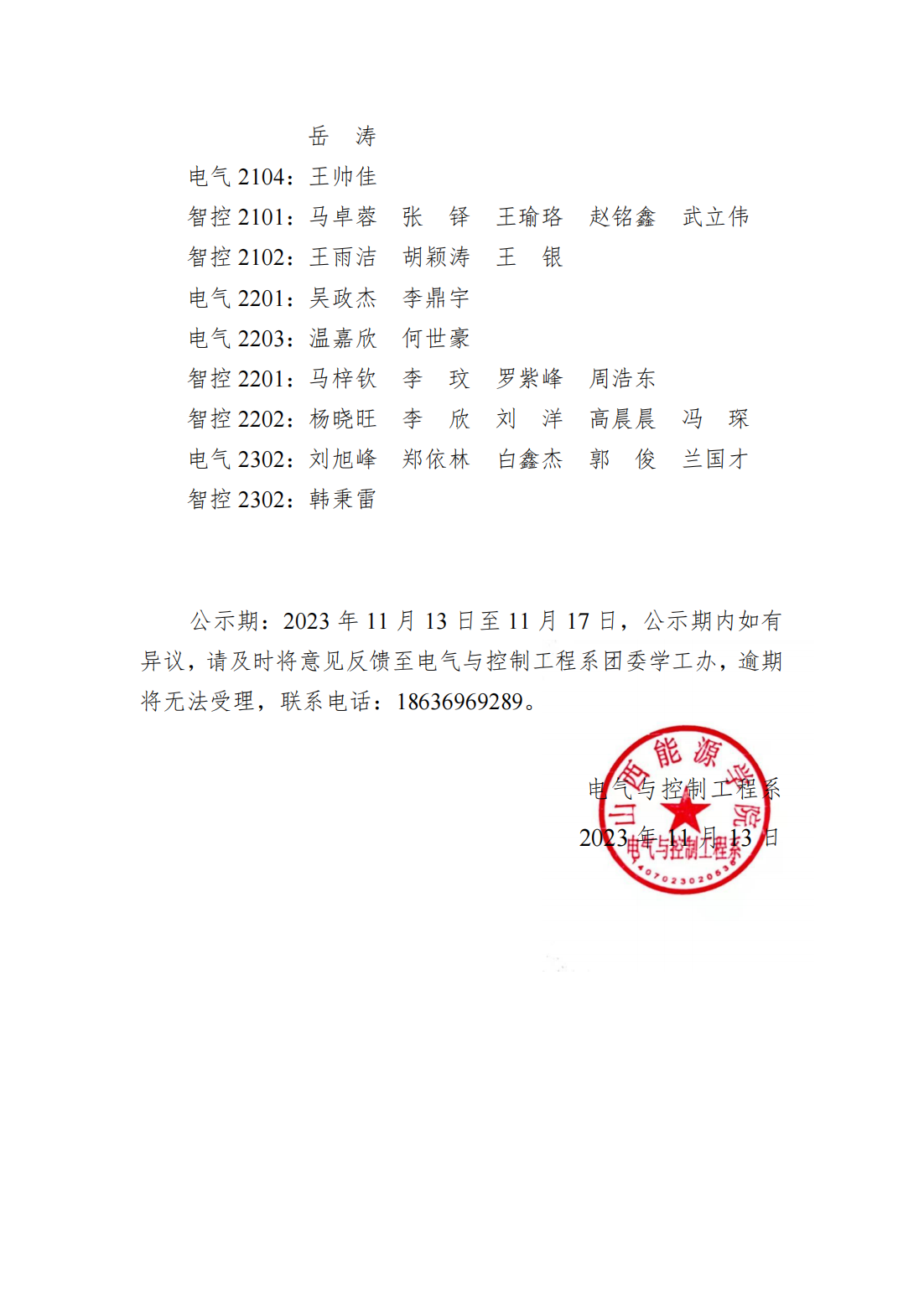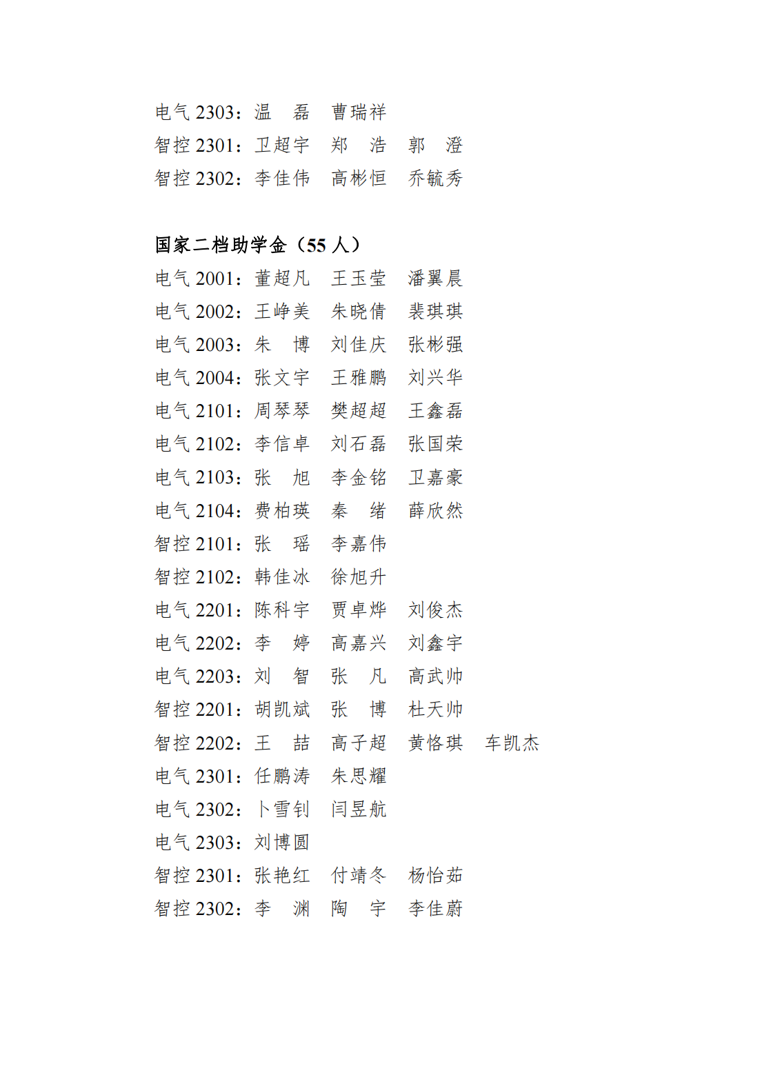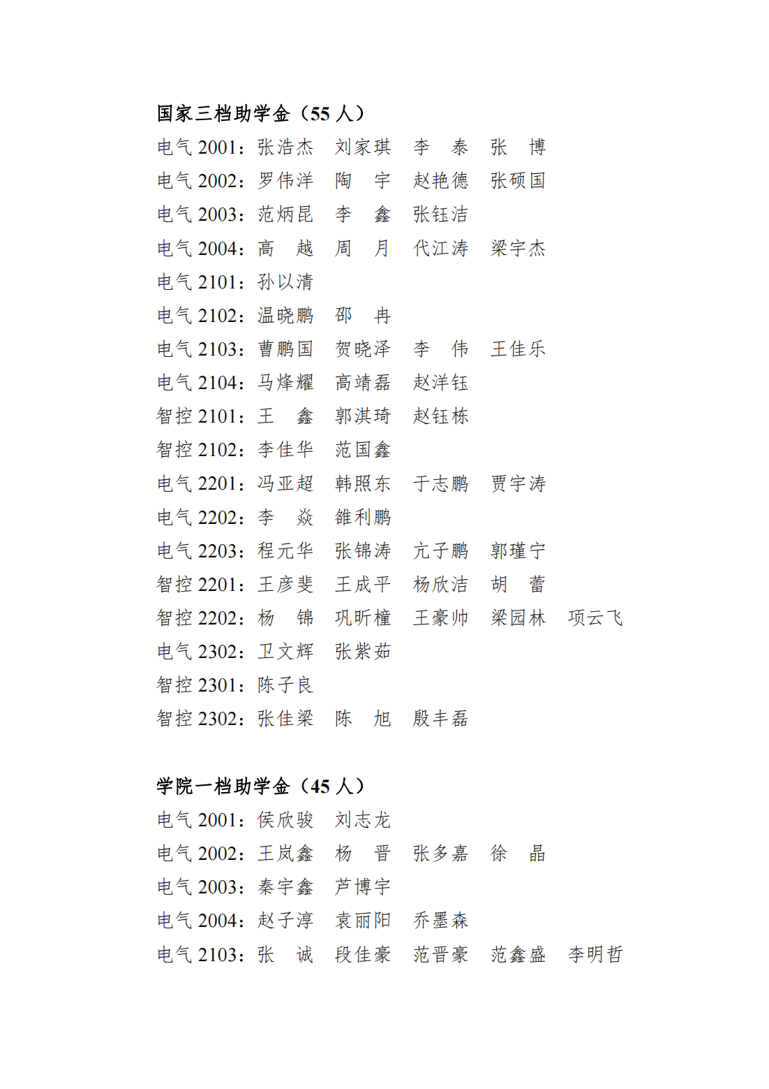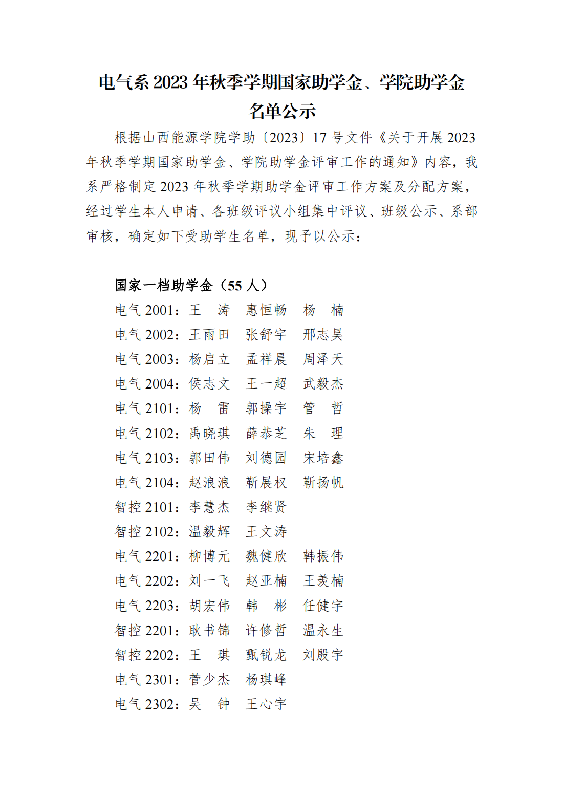 电气系2023年秋季学期国家助学金、学院助学金名单公示