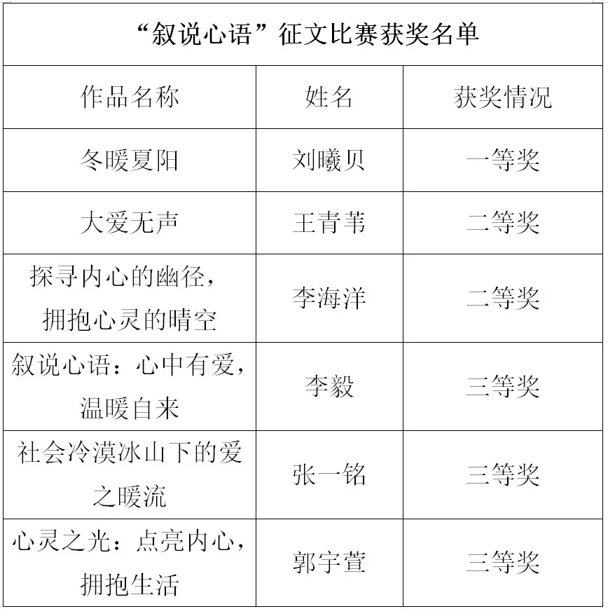 “叙说心语”征文比赛获奖名单