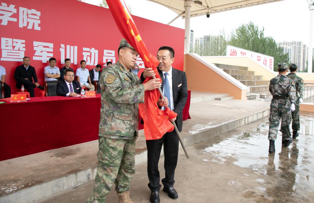 校党委书记冯锋代表学校党政和全体师生员工向各位新同学的到来送上热烈的欢迎和衷心的祝贺,向一直支持学院军训的省军区表示亲切的问候和诚挚的感谢。他对全体新生提出了三点希望:一是不尚虚谈,勤于学习实干。希望大家怀揣对知识的敬畏之心,勇敢地追求真理,不断地突破自我,创新前行。二是坚定意志,敢于迎接挑战。困难与挑战都是成长的必经之路,只有坚定意志,保持积极进取,努力向上生长,才能将过往的经历转化成阅历,拥有自我超越的力量和勇气。三是珍惜机会,乐于突破边界。不仅要成为知识的探索者,也要成为生活的艺术家,用自己的努力书写属于自己的精彩章节,永远热爱,永远向光,永远明媚!