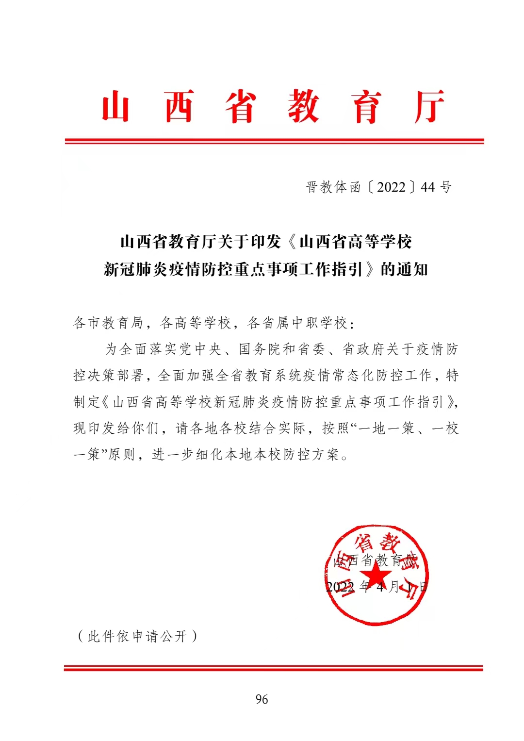 山西省教育厅关于印发《山西省高等学校新冠肺炎疫情防控重点事项工作指引》的通知