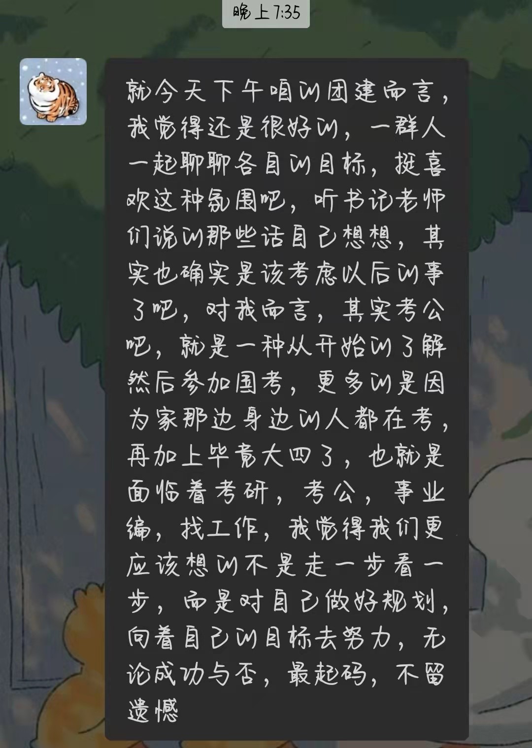 一语惊醒梦中人,接着同学们畅所欲言聊学习、聊考研、聊就业,聊未来,他们的情绪得到了释放,他们的心声我们听到了,他们的诉求有了回应,他们得到了进一步的关心,他们的脸上露出了开心的笑容……