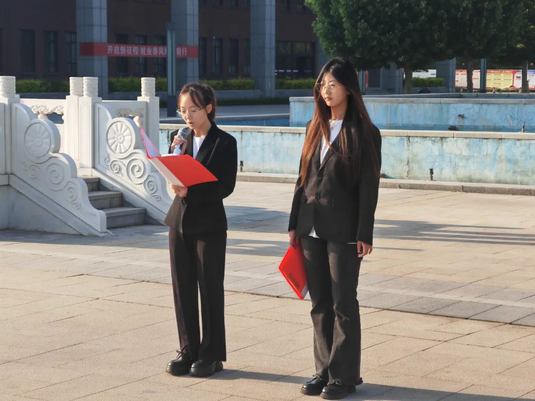 学生代表郑诗颖同学在国旗下进行演讲,新时代的大学生应铭记历史,珍惜当下学习时光,努力提升自我。要传承革命精神,坚定理想信念,关注国家发展,积极参与社会实践,为实现中华民族伟大复兴的中国梦贡献力量,展现青年的担当与使命。