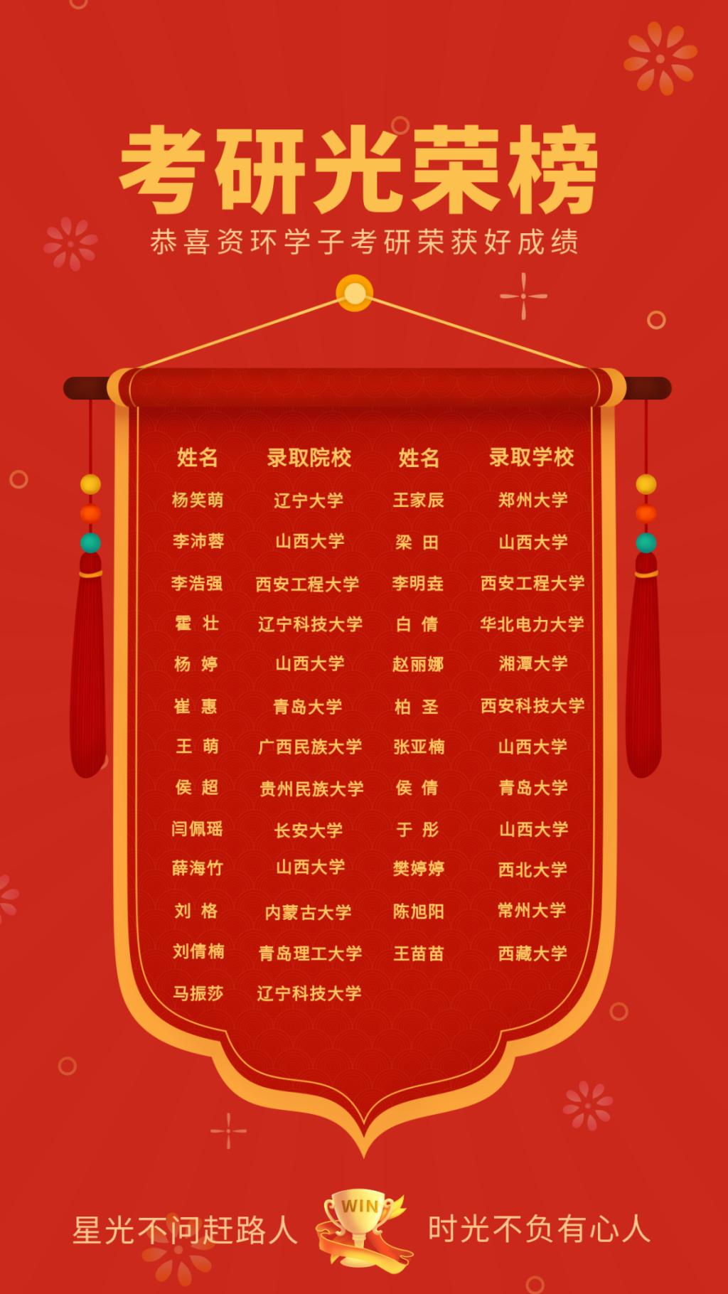 随着2022全国研究生入学考试复试结果的陆续公布,我系考研录取结果喜报频传,有25人进入自己心仪的学校,其中我系第一届环保设备工程专业录取人数达9人,录取率高达30%。优秀的班风,造就了如今的硕果累累。这个优秀班级是所有班级学习的榜样~希望所有资环学子以他们为榜样,互相帮助,彼此鼓励,勇攀高峰。