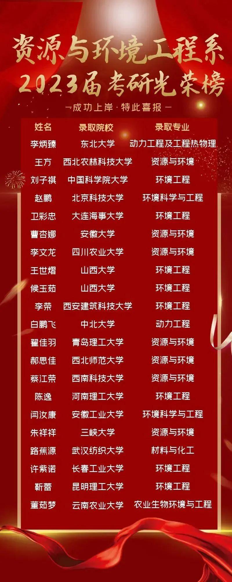 一路风雨兼程,一路披荆斩棘,历经酷暑寒冬,终于迎来春花烂漫。考研是一场逆流而上的旅行,是一场孤独的朝圣,他们四年的奋斗,终于不负韶华,给自己交上了一份满意的“研”途佳卷。随着2023年全国硕士研究生招生录取工作落幕,资源与环境工程系考研学子喜讯频传!