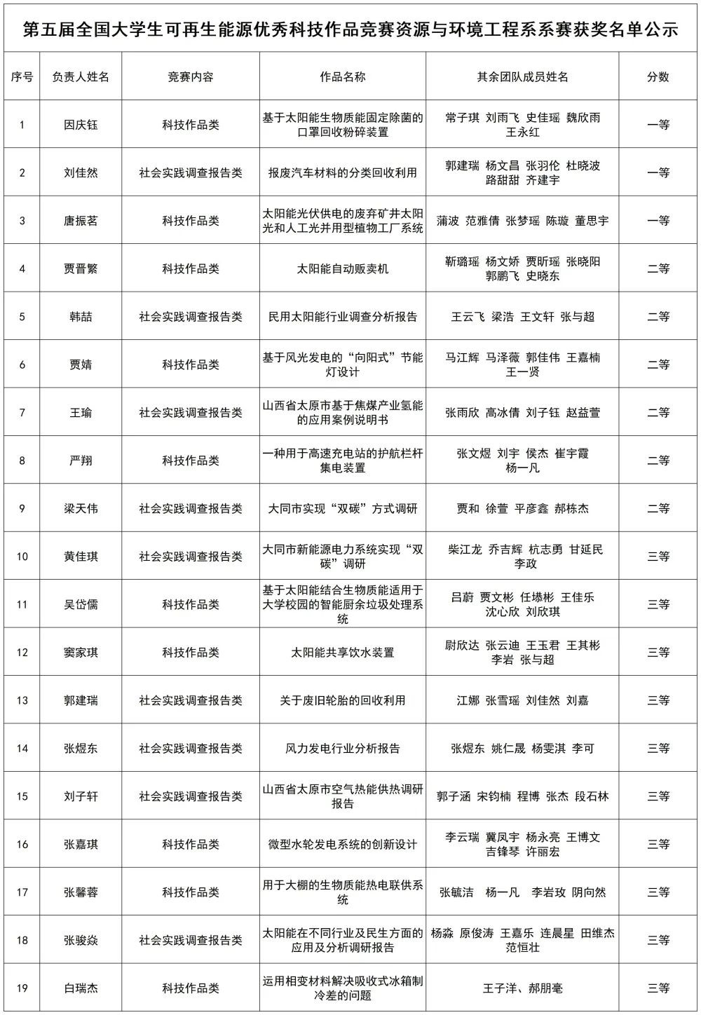 现将“全国大学生可再生能源优秀科技作品竞赛”资源与环境工程系系赛获奖名单公示如下: