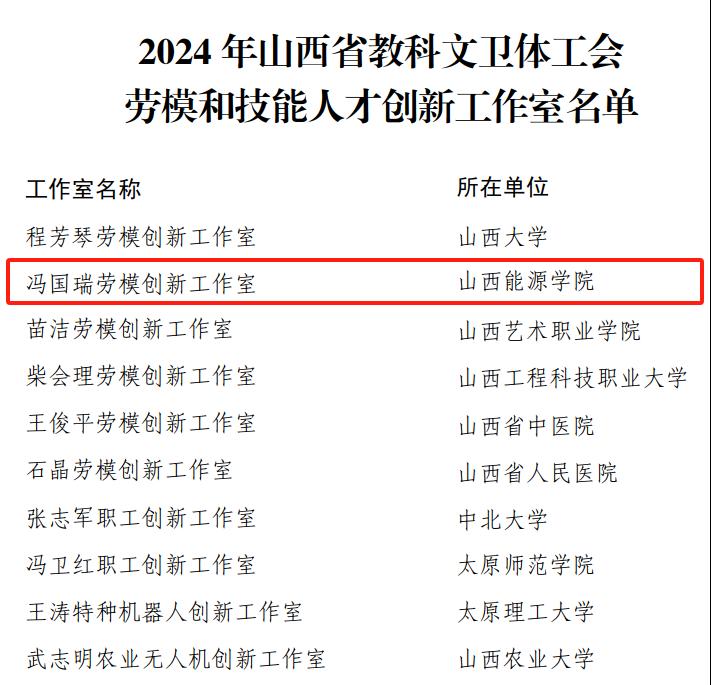 近日,山西省教科文卫体工会委员会下发了《山西省教科文卫体工会关于命名2024年劳模和技能人才创新工作室的决定》(晋教科文卫体工字〔2024〕73号),我校“冯国瑞劳模创新工作室”成功入选“山西省教科文卫体工会劳模和技能人才创新工作室”。