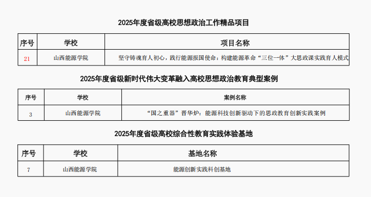 近日,山西省教育厅公布了2025年度山西省高校思想政治工作质量提升综合改革与精品建设项目立项结果名单,经各高校申报、资格审核、专家评审等程序,我校3个项目获批立项,其中包括省级高校思想政治工作精品项目1项,省级新时代伟大变革融入高校思想政治教育典型案例1项,省级高校综合性教育实践体验基地1项。