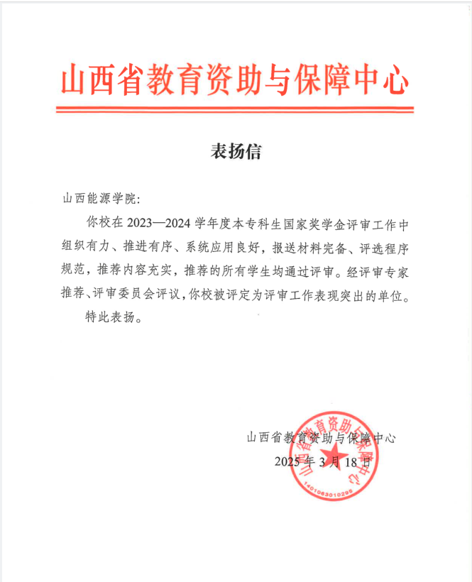 近日,我校收到山西省教育资助与保障中心发来的表扬信,信中特别指出,我校在2023-2024学年度国家奖学金评审工作中组织有力、推进有序、系统应用良好,报送材料完备、评选程序规范、推荐内容充实,推荐的学生均通过评审,获评“国家奖学金评审工作表现突出单位”。这是我校连续两年获此殊荣,充分体现了上级部门对我校资助育人工作的认可与激励。