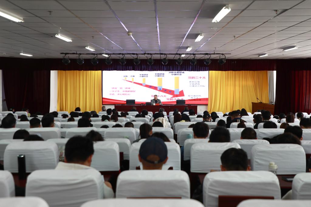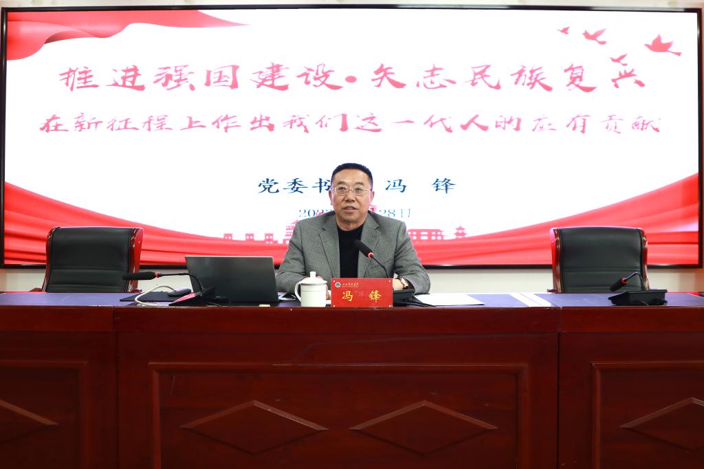 为深入学习宣传贯彻党的二十大重要指示精神,2023年3月28日下午,党委书记冯锋在综合楼二层报告厅以《推进强国建设 矢志民族复兴 在新征程上作出我们这一代人的应有贡献》为题为师生讲授开学第一课暨思政课首讲。各党总支书记、直属党支部书记、各部门负责人以及思政教师、学生代表近200人聆听了这堂课。党委副书记桑楠主持“开学第一课”。