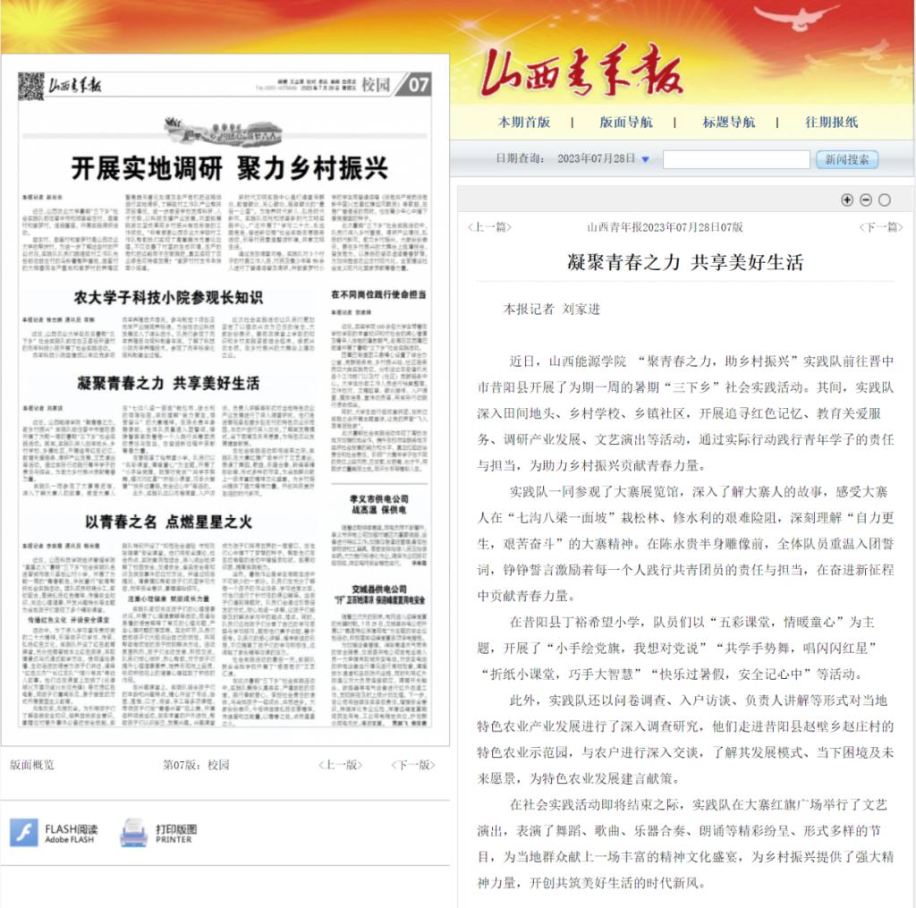 近日,山西青年报关注报道了我校“聚青春之力,助乡村振兴”实践队前往晋中市昔阳县开展暑期“三下乡”活动,并以《凝聚青春之力 共享美好生活》为题进行刊发。