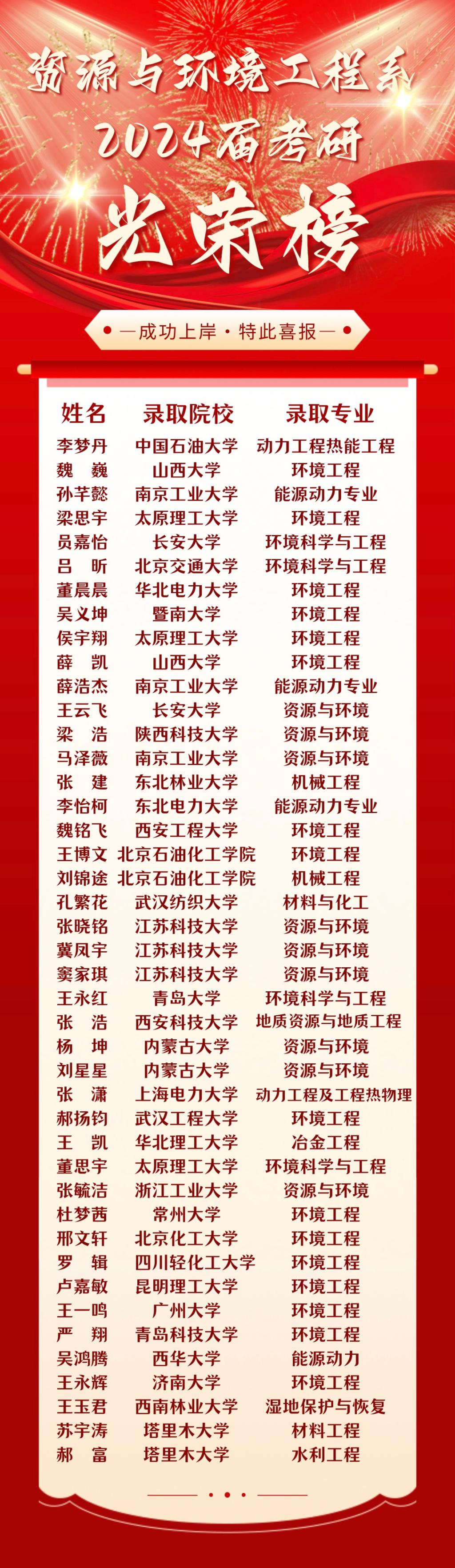 研路漫漫,终达彼岸;天道酬勤,柳岸花明。2024年全国硕士研究生录取工作落下帷幕,资源与环境工程系2024届毕业生考研录取再创佳绩。资源与环境工程系2024届本科毕业生共计194人,43人金榜题名,录取人数和录取院校层次与往年相比再次实现突破,更有部分考生被北京交通大学、暨南大学、中国石油大学、长安大学、华北电力大学、太原理工大学等211高校录取。截至目前,2024届毕业生升学率达22.16%,较往年突破新高。