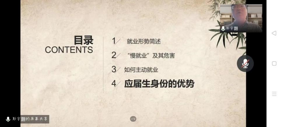 学院就业指导中心彭宇翾老师为同学们进行了就业指导,分别从就业形势简述、“慢就业”及其危害、如何主动就业和应届生身份的优势四个方面展开作了专题报告,勉励同学们要有认识现实的勇气,要有做出选择和尝试的魄力,更要有追求美好生活的信心。彭老师的报告内容丰富、通俗易懂,具有很强的针对性和指导性,深受同学们的好评和欢迎,会后同学们纷纷表示,听了彭老师的讲座很受启发和鼓舞,受益匪浅,使我们认清了形势,看到了自身的优势和不足,就业方向更明确了,信心也更增强了。