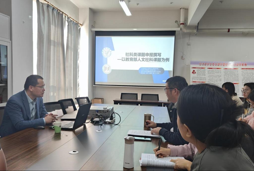 为进一步提升我校青年文科教师和科研骨干的课题申报撰写能力,加强学术交流,开阔我校青年文科教师的学术视野,提升青年教师科学研究水平。10月24日下午,由科技产业部主办、经济系承办的“学院大讲堂”系列学术讲座在教学楼2-3连廊2-215会议室举行。太原科技大学经济与管理学院鲁锦涛教授应邀作了题为“社科类课题申报撰写——以教育部人文社科类课题为例”的学术讲座,讲座由科技产业部副部长兼经济系行政负责人戴国宝副教授主持,他简要介绍了鲁锦涛教授的个人履历、学术研究方向及科学研究成果,并对鲁教授的莅临表示热烈欢迎。