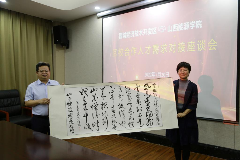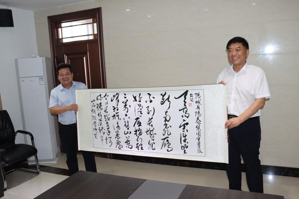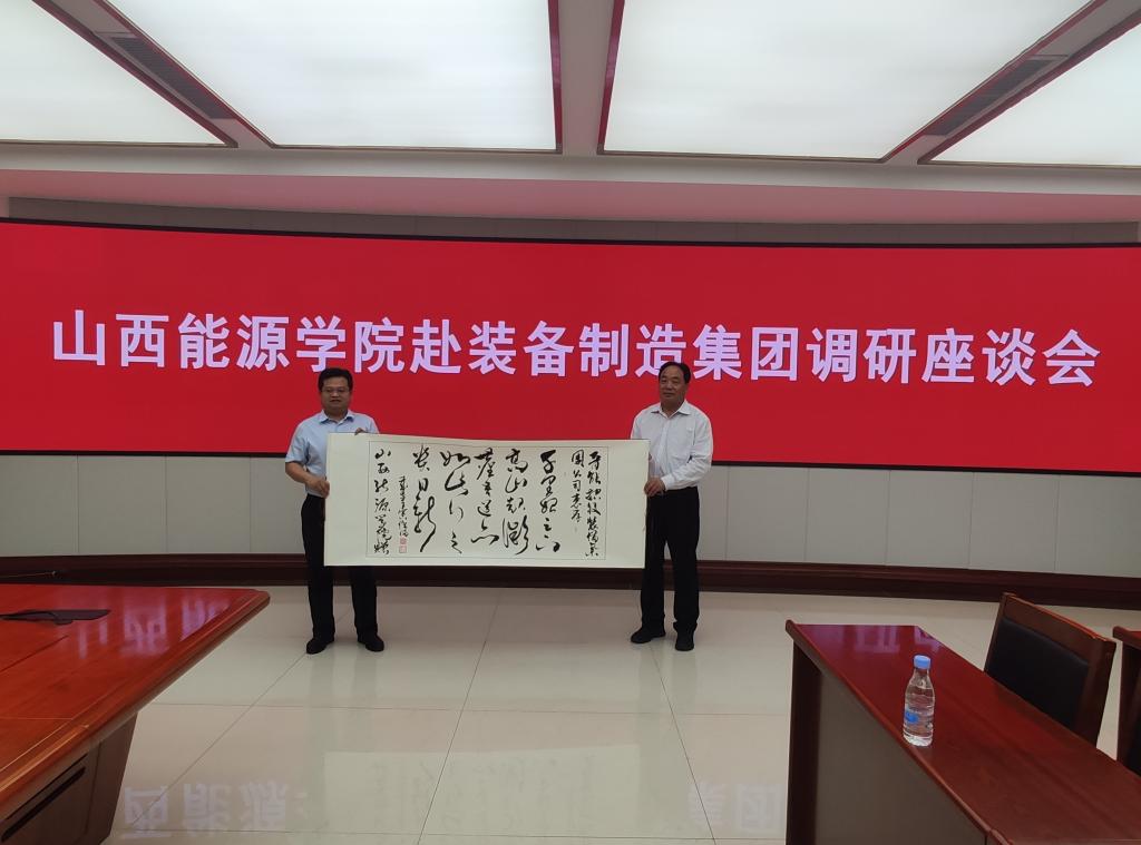 在调研结束后,冯国瑞副院长(主持行政工作)在与会人员的共同见证下,代表学校分别向晋能控股装备制造集团、晋城经济技术开发区、阳城县阳泰集团赠送了我校教师创作的书法作品。