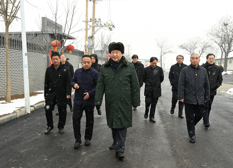 1月26日至27日,中共中央总书记、国家主席、中央军委主席习近平来到山西,看望慰问基层干部群众。这是26日下午,习近平冒雪在临汾市霍州市师庄乡冯南垣村考察。新华社记者 李学仁 摄
