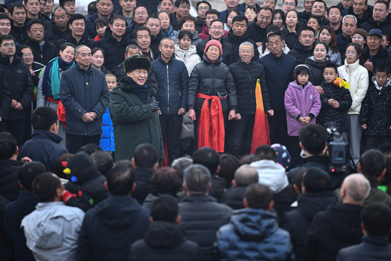 村文化广场上十分热闹,村民们打起威风锣鼓、扭起秧歌欢庆佳节。看到习近平总书记来了,人们高兴地欢呼起来。习近平对乡亲们说,我们党的根本宗旨就是为人民群众办好事,为人民群众幸福生活拼搏、奉献、服务。我们如期打赢了脱贫攻坚战,如期实现了全面建成小康社会目标,现在踏上了全面建设社会主义现代化国家新征程。建设现代化国家离不开农业农村现代化,要继续巩固脱贫攻坚成果,扎实推进乡村振兴,让群众生活更上一层楼,在推进农业农村现代化中越走越有奔头。