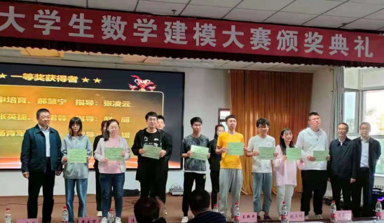 进行颁奖仪式。我校在本次建模大赛中取得优异成绩,其中省级一等奖5名,省级二等奖11名,省级三等奖22名。按照奖项顺序,强基学院教师为三等奖学生进行颁奖,辛书贤部长、王永安部长、任家智主任、任丽芳主任为二等奖学生进行颁奖,孟文俊副院长为一等奖学生进行颁奖,并合影留念。随后,学生代表李振东发表获奖感言,李振东讲到他们团队在建模大赛取得优异的成绩,离不开团队的不懈努力和团结奋战,并表示这次建模大赛对自己学业的提升有很大帮助。
