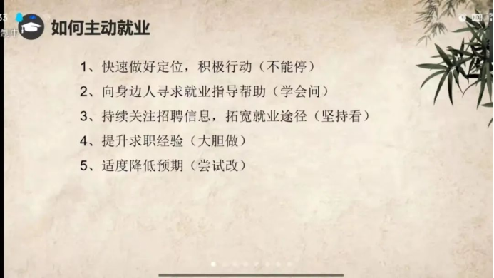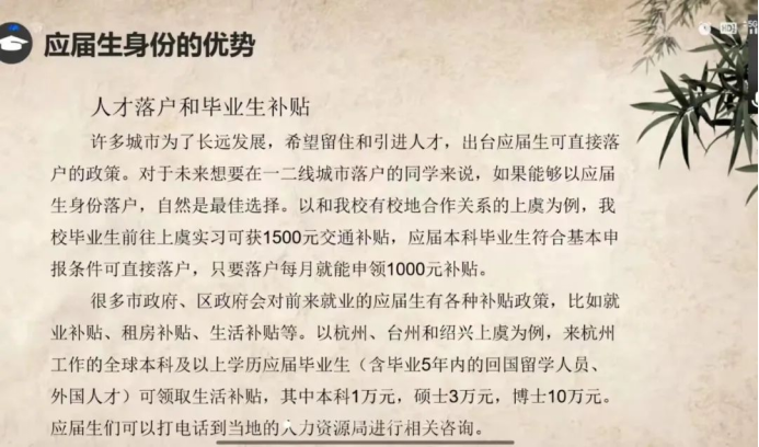 其次,招就部彭老师从就业形势、“慢就业”及其危害、如何主动就业和应届生身份的优势四个方面进行讲解。提醒同学们要抛弃不切实际的幻想,实事求是的解决问题,学会承担责任,为自己的未来着想。绝不敢错过“校招”这一绝佳机会(校招进入好公司的机会更多,要求相对较低,基本属于正式招聘);
