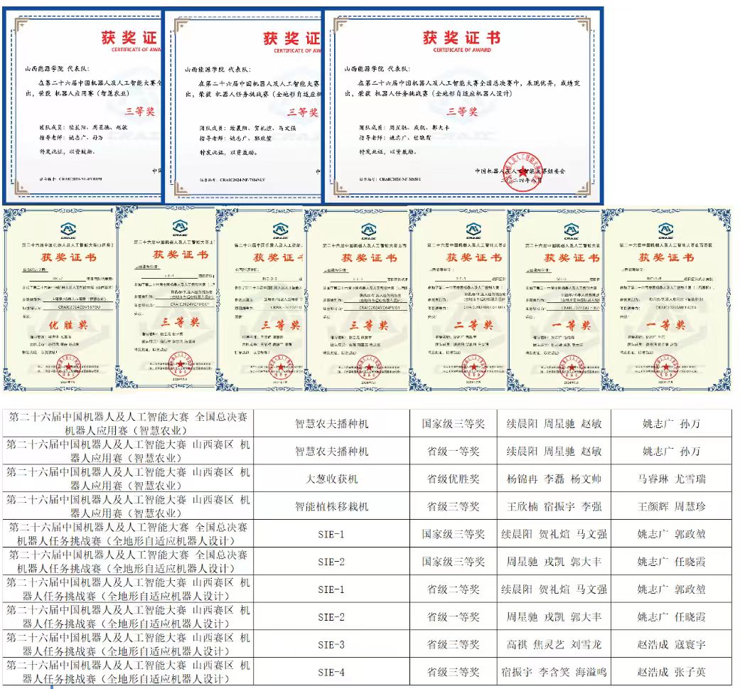 此外,在机器人任务挑战赛(全地形自适应机器人设计)山西赛区的角逐中,“SIE - 1”和“SIE - 2”项目分别取得了省级二等奖和省级一等奖的好成绩,并在全国总决赛中双双荣获国家级三等奖。