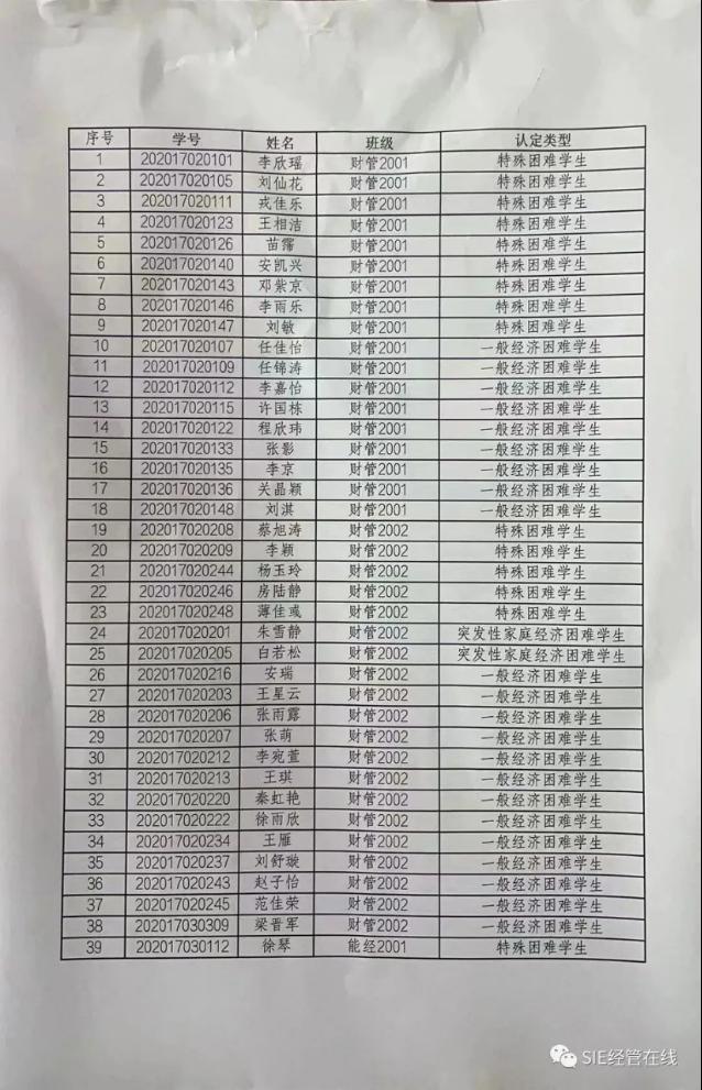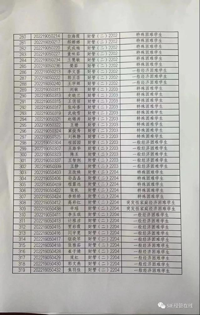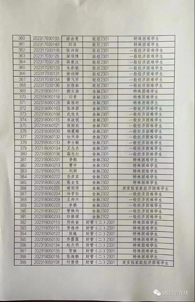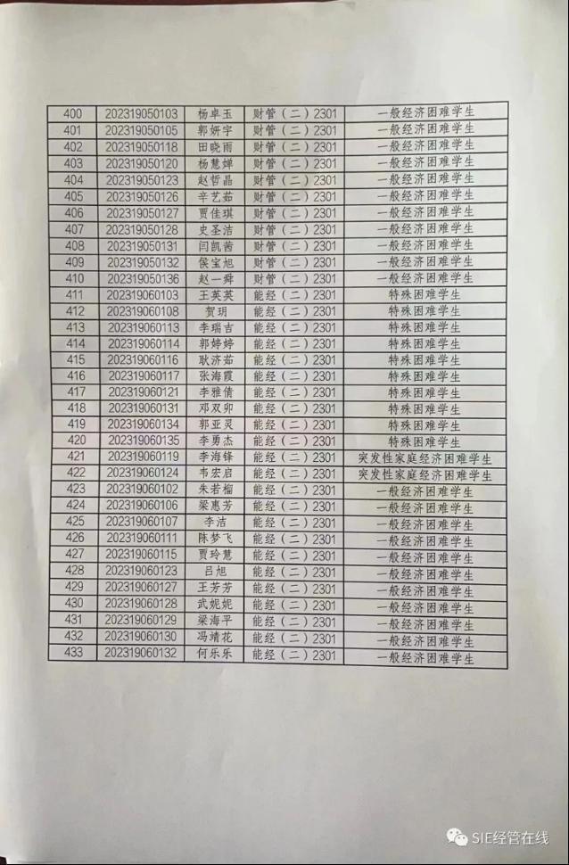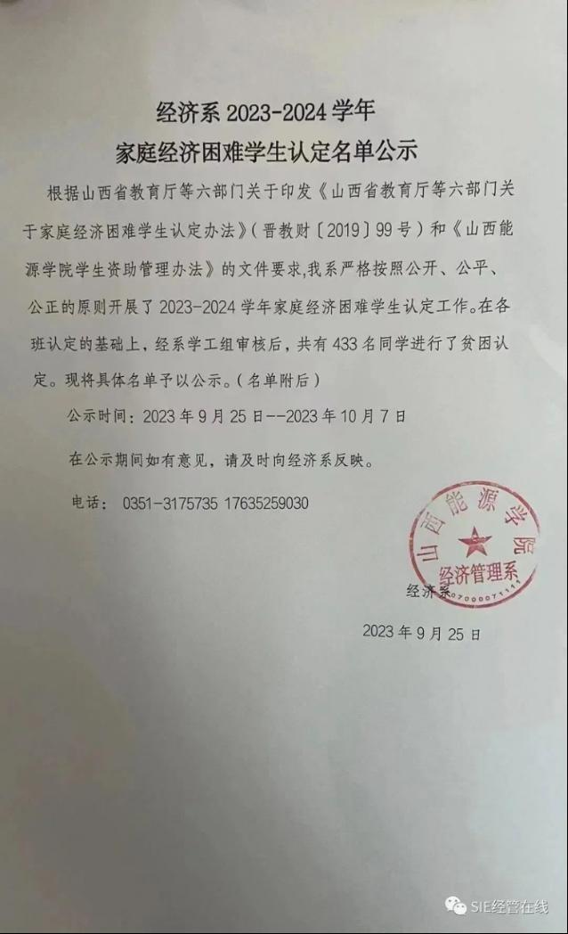根据山西省教育厅等六部门关于印发《山西省教育厅等六部门关于家庭经济困难学生认定办法》(晋教财[2019]99号)和《太阳集团官网学生资助管理办法》的文件要求,我系严格按照公开、公平、公正的原则开展了2023-2024学年家庭经济困难学生认定工作。在各班认定的基础上,经系学工组审核后,共有433名同学进行了贫困认定。现将具体名单予以公示。(名单附后)
