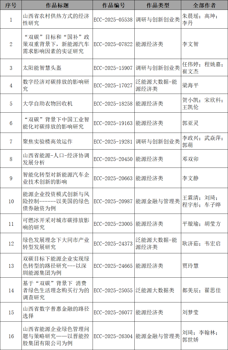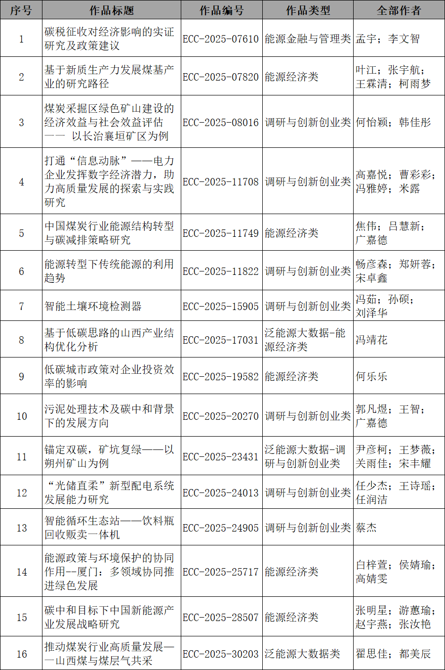 第十一届全国大学生能源经济学术创意大赛,我校报名217项,提交作品58项,经形式审查,有效作品56项。经学校组织评审,本科生组共44项作品获奖。其中本科生组一等奖12项,二等奖16项,三等奖16项。具体名单公示如下(同等奖项按作品编号排序)。