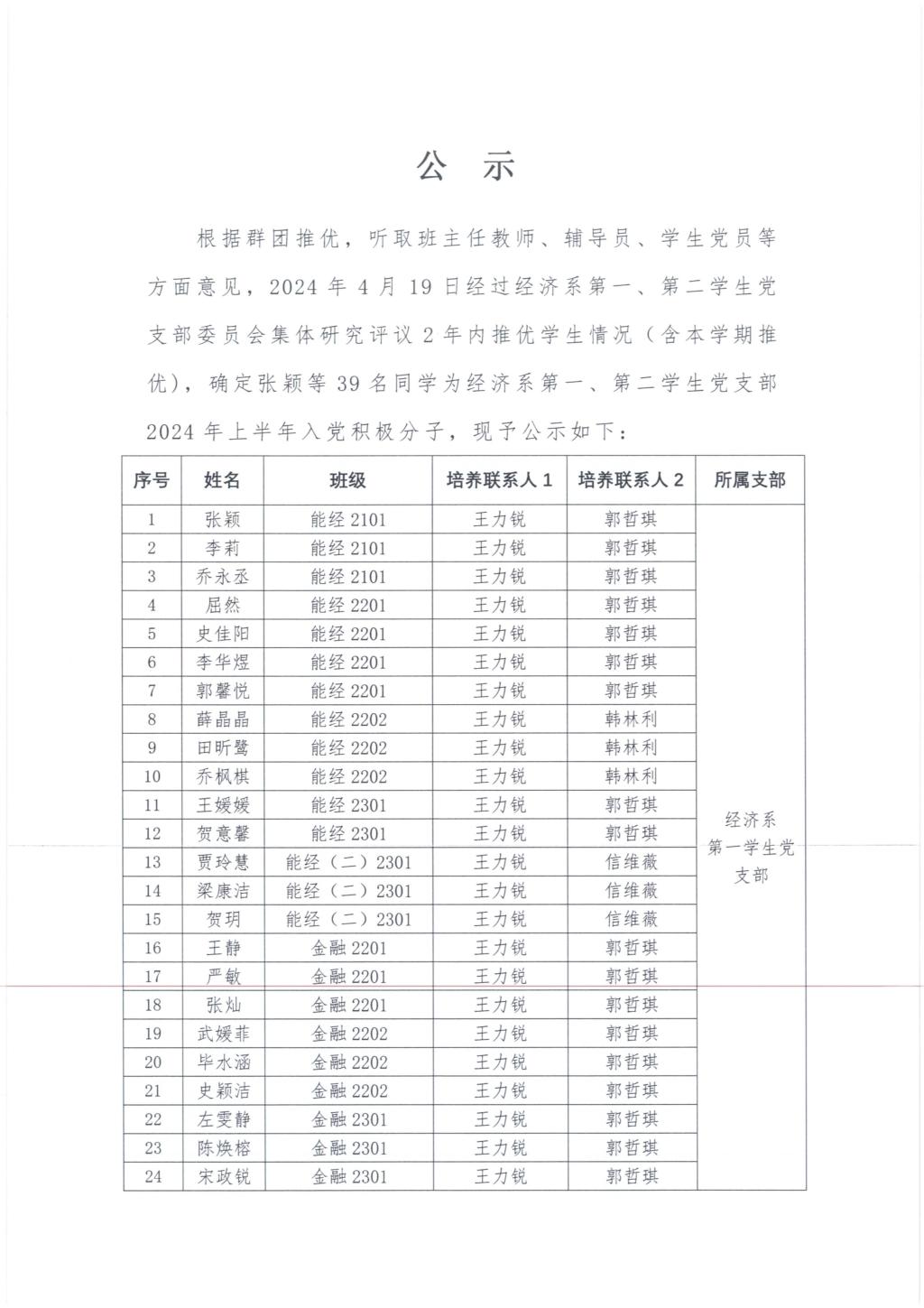 经济系2024年上半年入党发展对象名单公...
