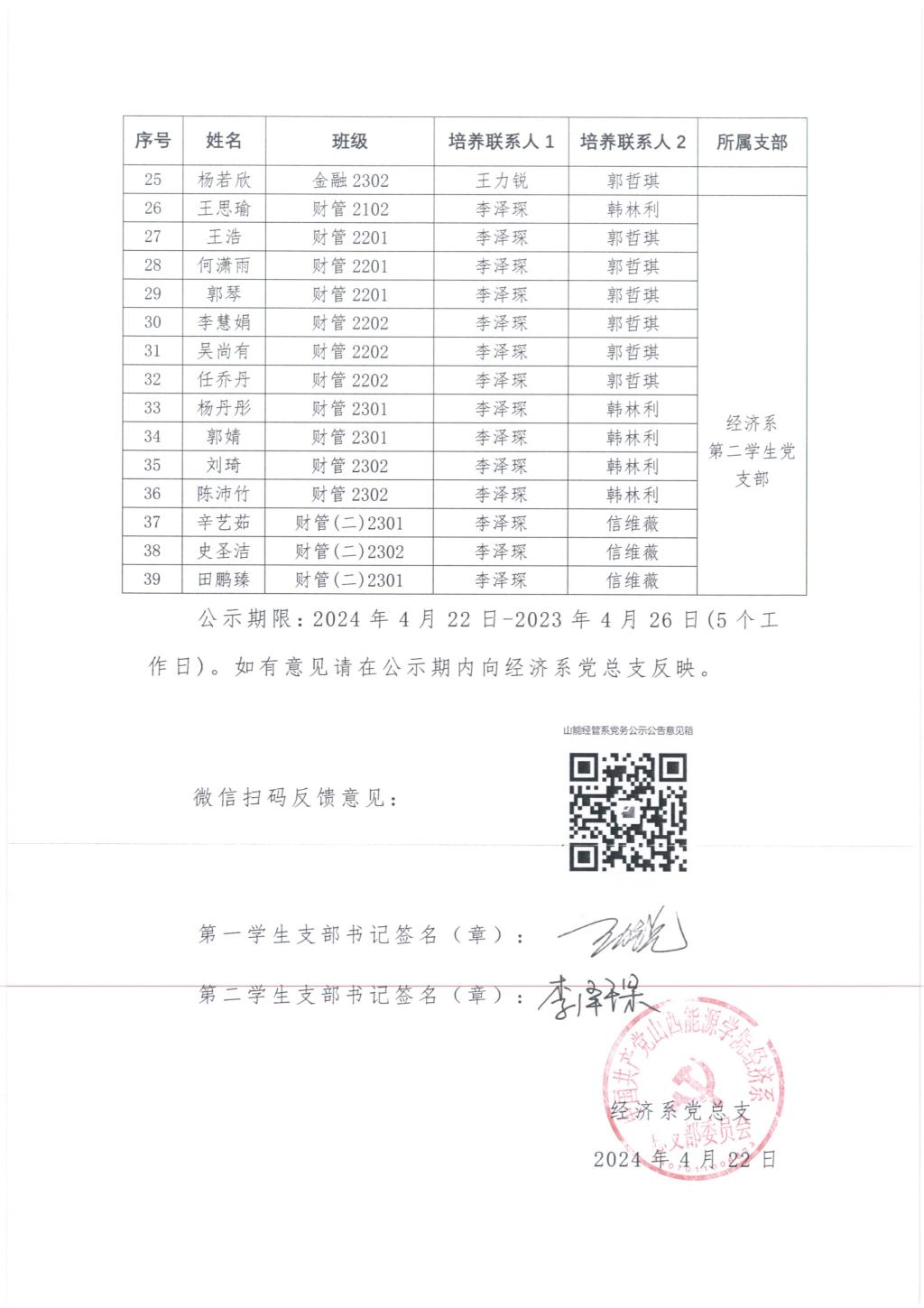 经济系2024年春季入党推优名单公示