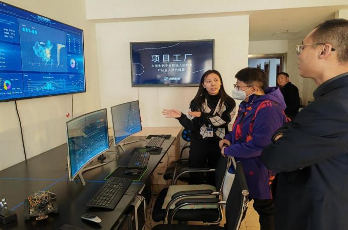 (在项目工厂机构老师为闫斐副书记讲解项目内容)