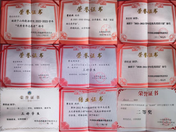 曹欣雨同志连续三年综合测评成绩位列班级前三,连续两年获得“三好学生”,荣获“国家励志奖学金”、“学院奖学金”等奖项。在学好专业知识外,她还努力学习课外知识,参加学校组织的活动,并获得2022年大学生创新创业训练计划项目国家级和省级立项、2023年大学生创新创业训练计划项目省级立项、第八届“互联网+”大学生创新创业大赛系赛一等奖和二等奖等奖项。她不断地在学习过程中提高个人素质,努力使自己成为一名德智体美劳全面发展的综合型人才。