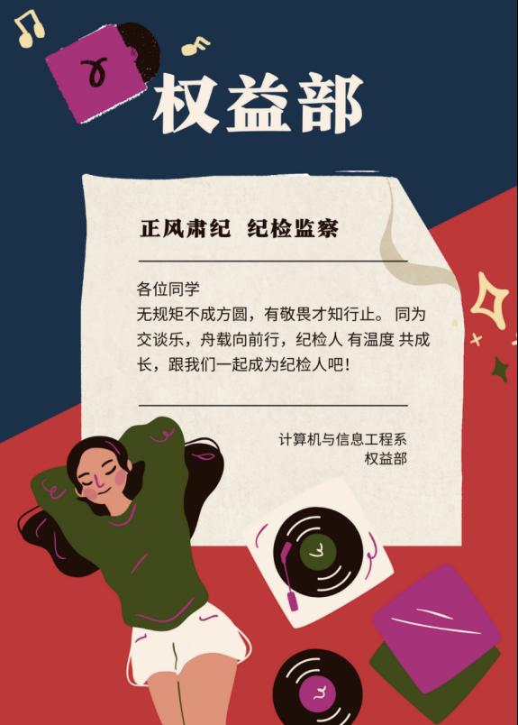 权益部是以监督考勤和学风建设为主的部门。协助主席团制定学生会的各种规章制度并监督执行;配合协助学生会各部门的工作,并进行监督和督促;对学院各班级进行课堂情况考勤;对班级平时的课堂情况(旷课、请假等)进行不定时的检查,并记录检查结果,上报学校;对学院学生寝室进行例行检查;对寝室的生活安全,违规电器检查;不定期分配有关人员到寝室进行抽查,检查是否有使用大功率电器;配合系各部门组织的各项活动,记录出勤情况、维持会场秩序等,保证活动顺利进行。