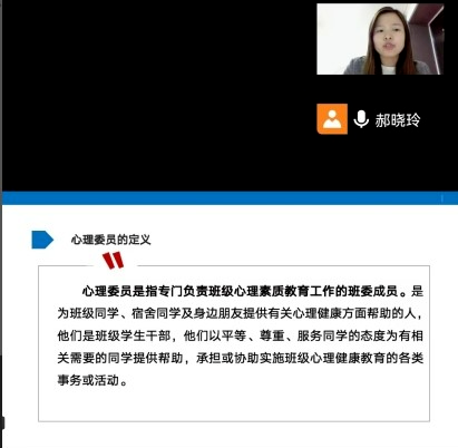 作为本次线上培训的重点内容,心理老师在向各参会同学着重讲解的同时,要求大家在日常学习与生活中,多多关注心理存在缺陷或心理受到刺激的同学,在他们遇到困难的时候,及时给予帮助,如果出现异常也要及时地告知老师。