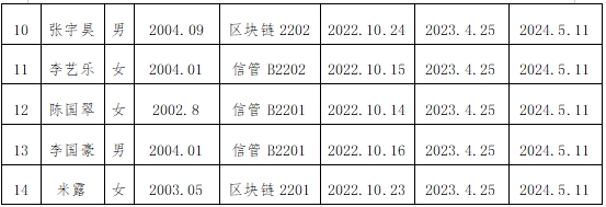 根据个人现实表现和党支部培养教育考察情况,2024年5月11日,经计算机与信息工程系学生党支部大会研究讨论,拟确定李禾、安楠等14名入党积极分子为党员发展对象。现对拟确定的党员发展对象基本情况予以公示,公示期为5个工作日,自2024年5月13日—2024年5月17日。