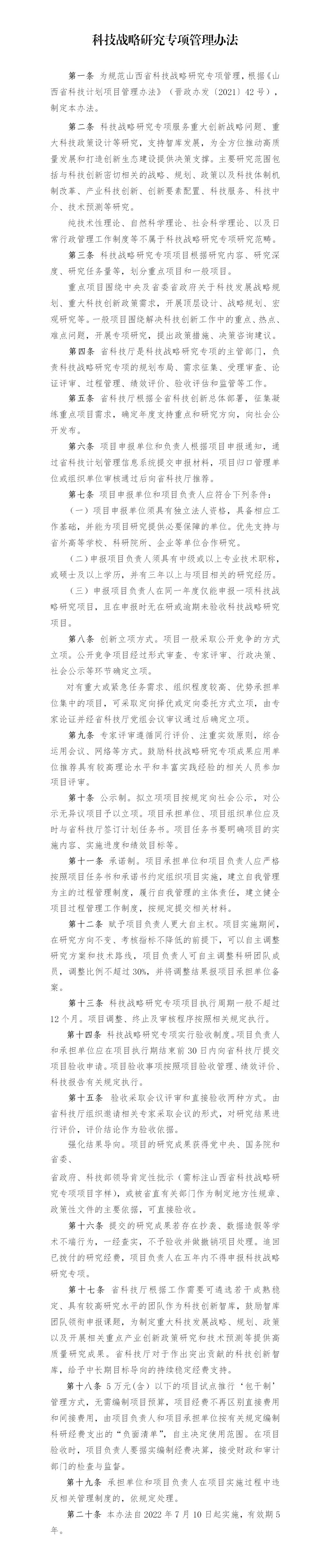山西省科学技术厅关于印发《科技战略研究专项管理办法》的通知