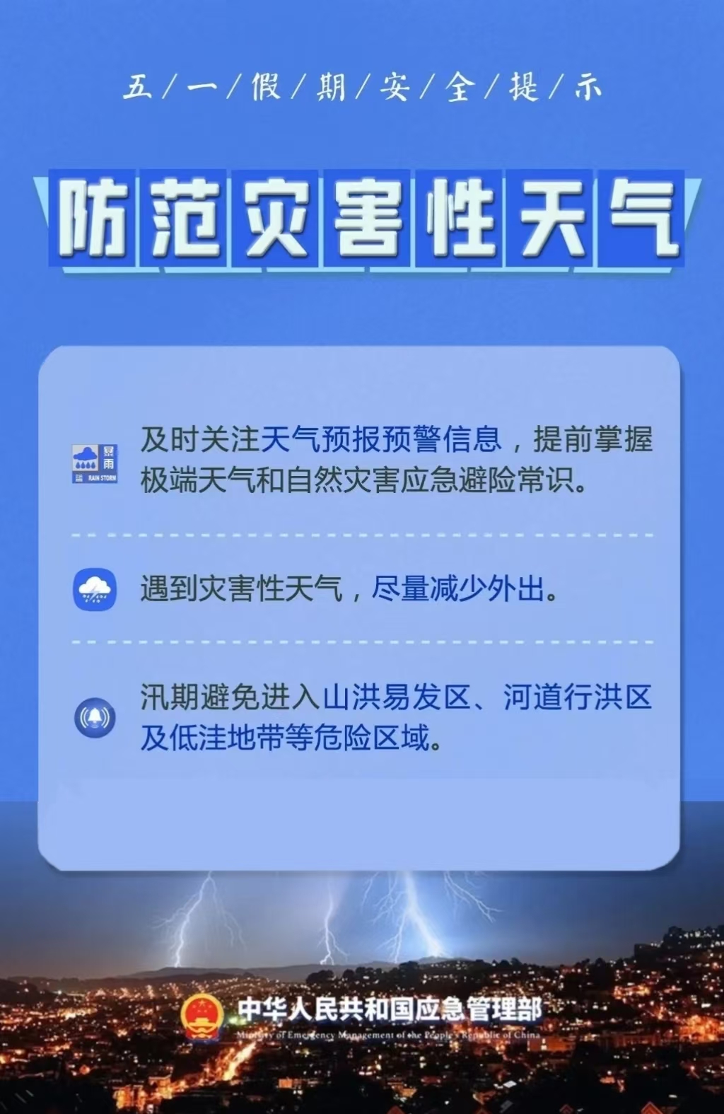 密切关注气象部门发布的降水、强对流天气等预报预警,防范强降雨可能引发的山洪、泥石流、落石等地质灾害和城市内涝。